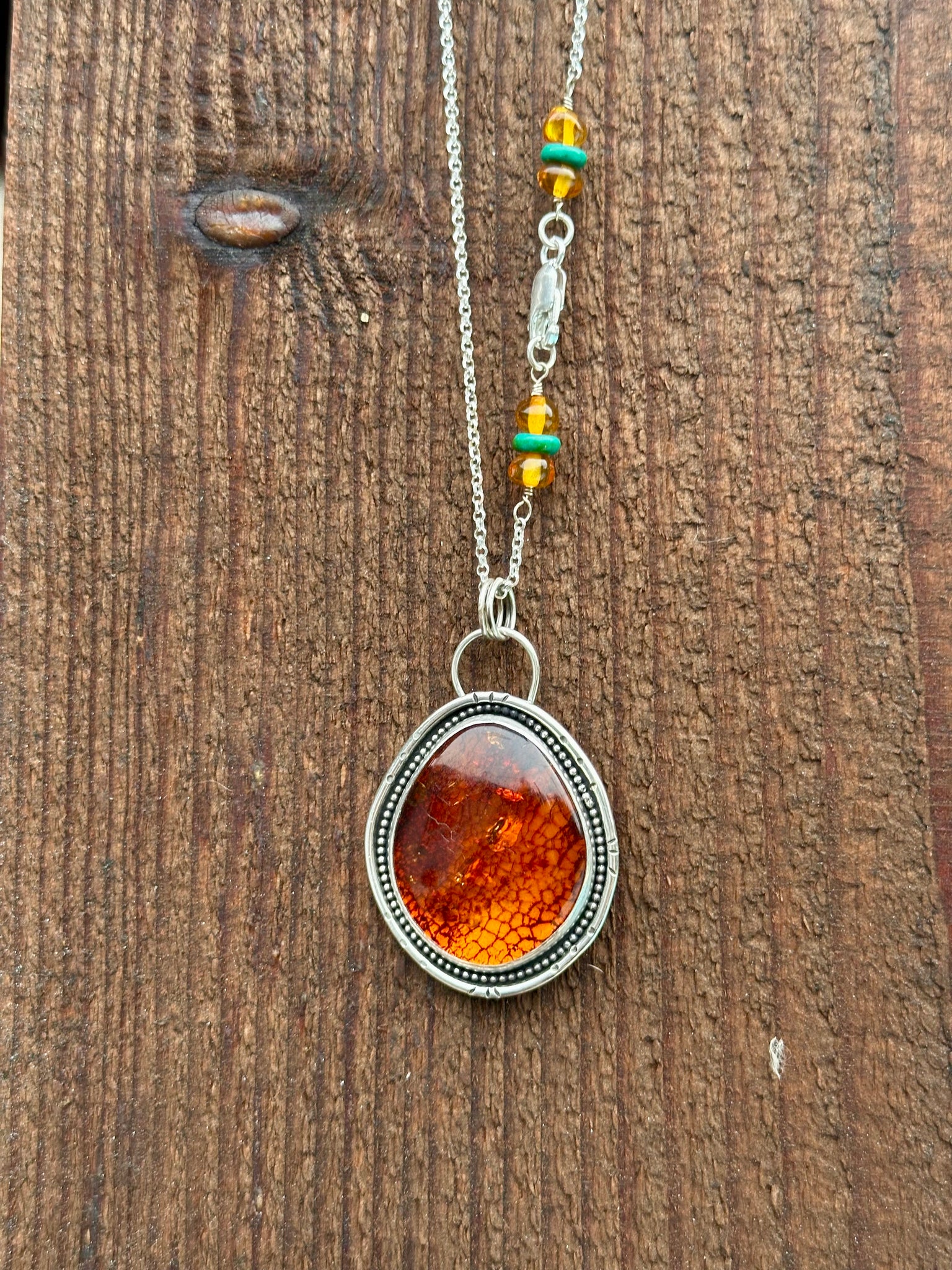 Lithuanian Amber Pendant set in sterling silver on a 16" chain with beaded accents.