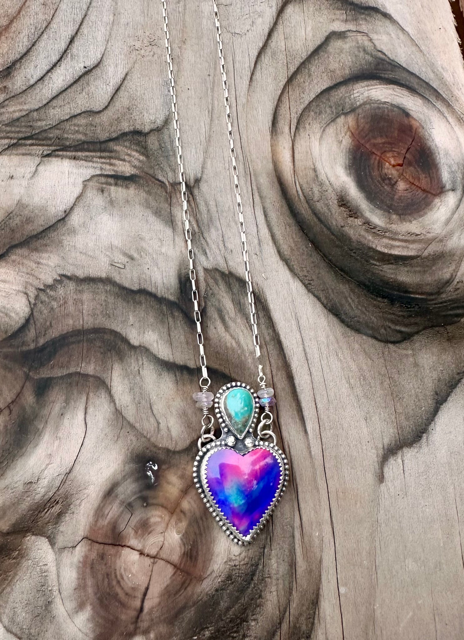 Aurora Opal and Turquoise Heart Necklace set in sterling silver with beaded accents on a 16" chain.